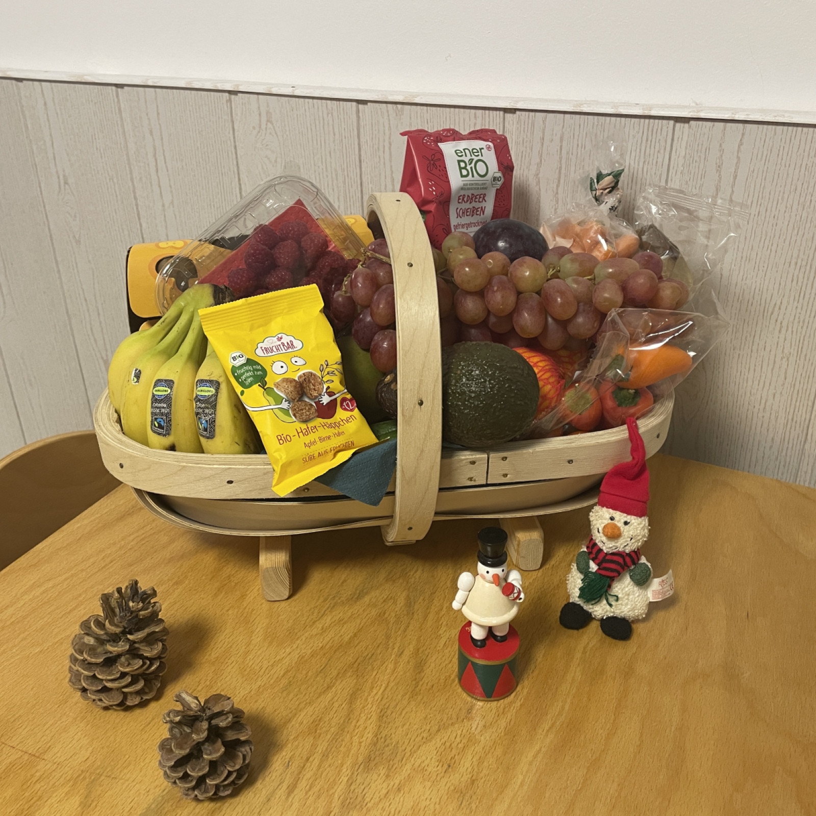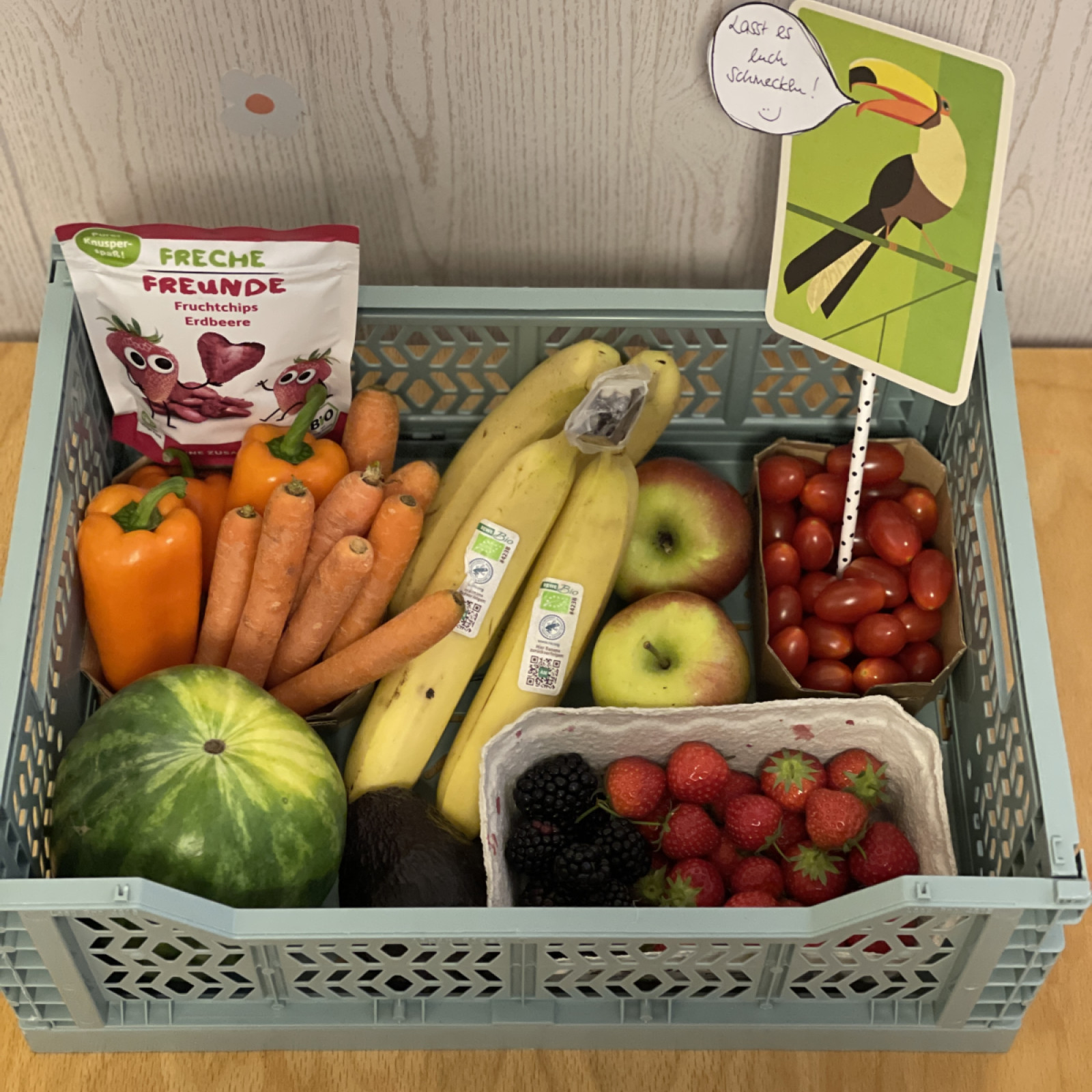 Wöchentlich werden wir von den Eltern meiner Tageskinder mit einer reichlich gefüllten Obst/ Gemüsekiste überrascht .Für die Kinder ist es jedesmal ein Highlight diese auszupacken .